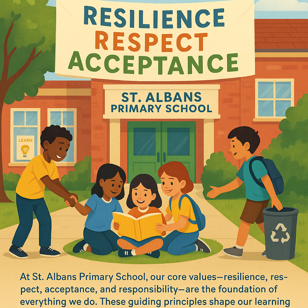 At St. Albans Primary School, our core values- resilience, respect, acceptance, and responsibility, are the foundation of everything we do. These guiding principles shape our learning environment and inspire students to strive for their personal best. We empower our students to take ownership of their learning and behaviour, fostering independence, integrity, and a lifelong love of learning.